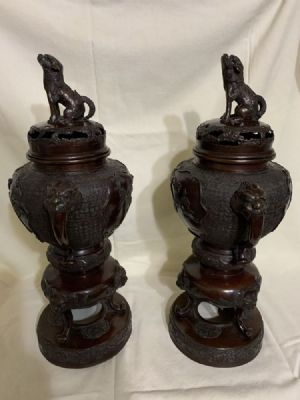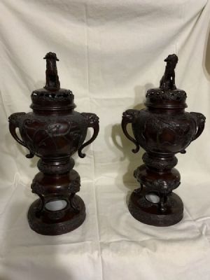 Large Antique Bronze Incense Burner Meiji Period (1886-1912) Pair This is a pair of Large Antique Bronze Incense Burners of the Meiji Period (1886-1912). Decorated in relief with birds, the relief carving is lyrical and realistic. The handles are Phoenix heads or Dragon heads. the legs have head on each leg. The lid has open work design with a guardian Foo Dog on top. The beautiful work in the dark bronze is in excellent condition. It is rare to find a matched pair of Bronze Incense Burners of this quality. 16" tall, 8" from handle to handle. See the pictures for the beauty and condition of the pieces. If you have any questions, pleae email me. Thanks for looking. $3,250.00