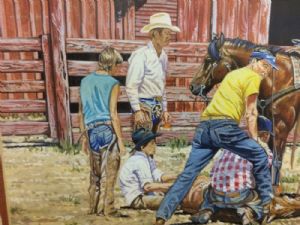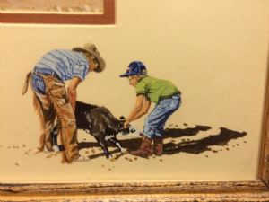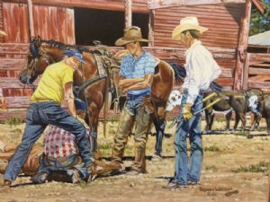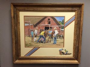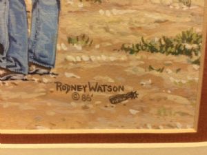 Rodney Watson Gouache Western Painting "Summer School"Rodney Watson Gouache Western Painting "Summer School" has beautiful detail work and you are getting two paintings, a small one on the matt, which is unusual. Watson has built a reputation as a talented Western artist known for his pen-and-ink drawings as well as landscapes and characters. He is what is known as a cowboy artist, chronicling scenes of landscapes, animals and people who live the western lifestyle. He uses gouache (opaque water paint) exclusively now. He is also Museum Director at Wayland Baptist University. This is one of his paintings from 1986 and it is copyrighted. the frame size is 21 1/2"x 24 3/4", the large picture is 11"x 14". The painting is in mint condition. Texas res 8.25% sales tax. If you have any questions please email me. Thanks for looking. $850.00
