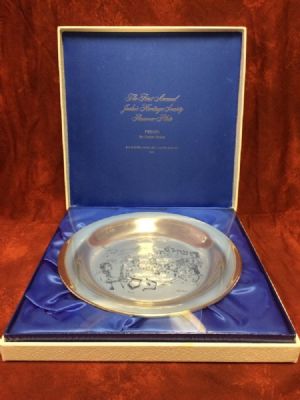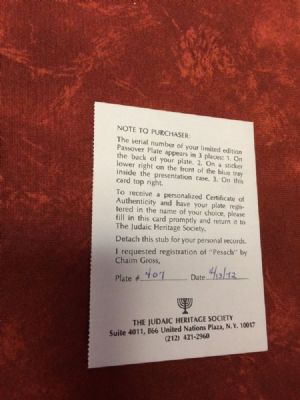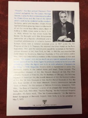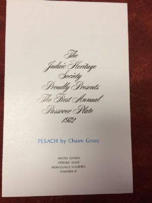 Pesach Sterling Silver Passover Plates by Chaim Gross Mint #407 This is The Judaic Heritage Society's First Annual Passover Plate c. 1972. "Pesach" by sculptor Chaim Gross, a beautiful etched solid Sterling Silver plate depicting a Seder scene rich in tradition. The plate is 8" diameter and 6.6 oz in weight. This is brand new, still in the plastic wrap and has been in it's case. Look at the pictures to see what comes with the plate and the condition. If you have any questions please email me. Texas residents 8.25 sales tax. Thanks for looking. $1,075.00