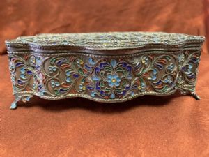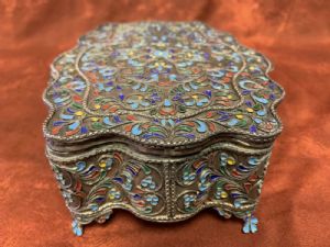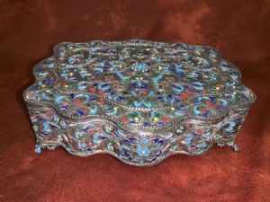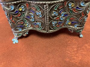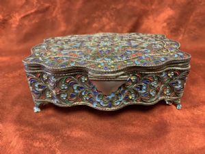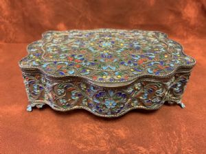 Rare Large Antique Russian Silver & Enamel Box This is a beautiful Large antique Russian Silver and Enamel Box. It is in very good condition for the age. See pictures for beauty and condition. There is only one mark I can find on the inside bottom of the box, 1000. The box is a large size: 7" long, 5 1/2" wide, 1 3/4" thick, from feet to top of box 2 1/4". The weight of the box is 435 grams. The enamel work on the box and feet is beautiful. If you have any questions please email me. Texas res 8.25% sales tax. Thanks for looking. $6,000.00